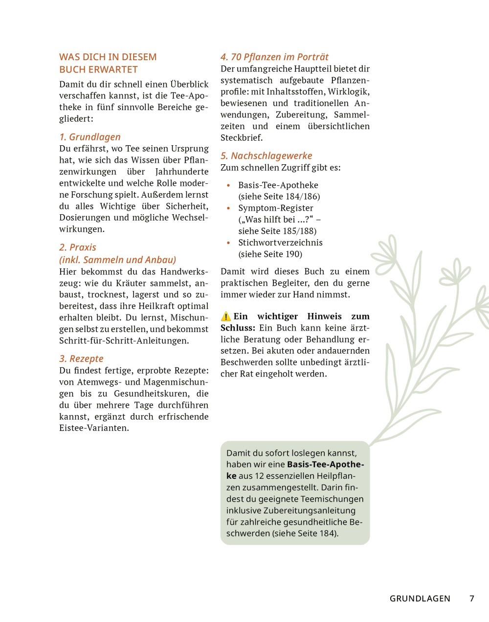 Erfahre, wie Tees nicht nur wunderbar schmecken, sondern auch deine Lebensgeister wecken, als sanfte, prophylaktische Medizin dienen und gezielt Beschwerden lindern können. Dieses Buch vereint wissenschaftlich fundierte Erkenntnisse zu Inhaltsstoffen und Wirkungsmechanismen mit dem Wissen und den Erfahrungen vieler Generationen. Es nimmt dich mit auf eine kulturelle Entdeckungsreise durch die Geschichte des Tees in verschiedenen Teilen der Welt.